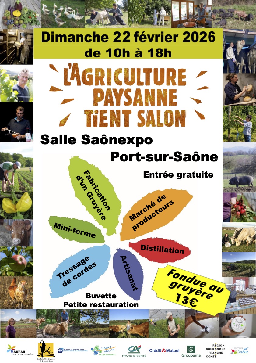 La Confédération paysanne de la la Haute-Saône et l'ADEAR70 organisent le dimanche 22 février 2026 de 10h à 18h à Port-sur-Saône la 4° édition de l'Agriculture paysanne tient Salon. Venez…