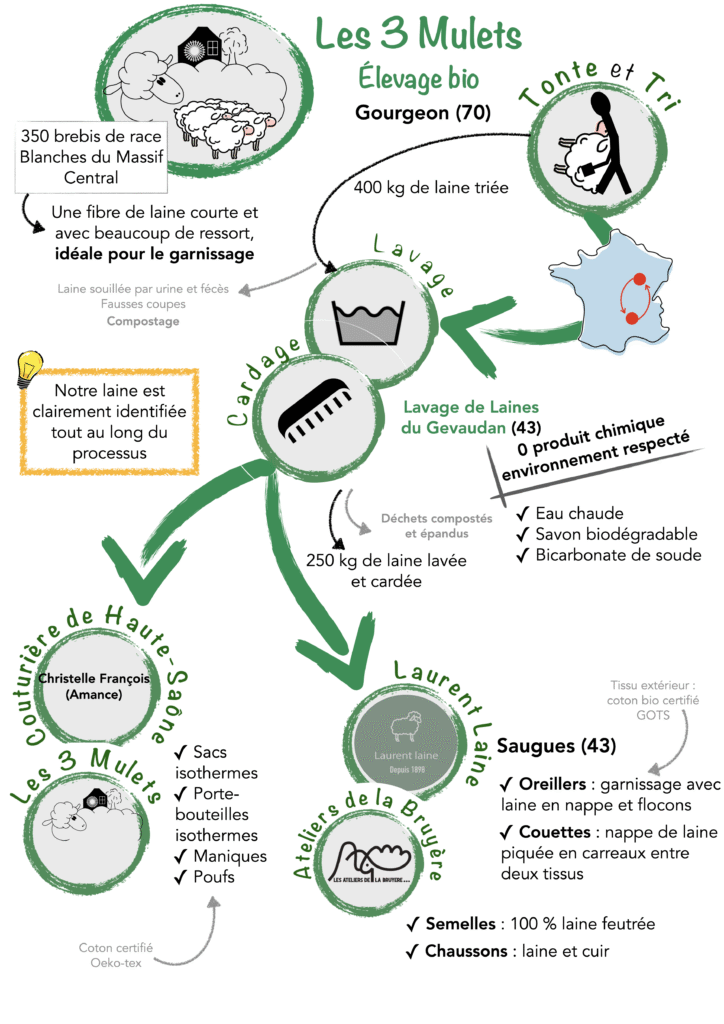 Tous nos produits sont fabriqués à partir de la laine de nos propres moutons, dans le respect des matériaux et du cycle de la ferme.